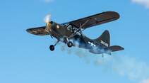 Die kleine Stinson L-5 (OY-1) des Wing war an diesem Tag sehr beschäftig und flog in regelmäßigen Abständen Rundfluggäste über die schöne umliegende Landschaft. Die Stinson, die den Namen „Stinsi“ auf der Cowling trägt, ist einer der legendären L-Birds aus dem Zweiten Weltkrieg. Die L-5 ist dabei der größte und stärkste Vertreter dieser Gattung, der Liaison-Flugzeuge. Diese waren meist für Verbindungs-, Aufklärungs- oder Evakuierungseinsätze eingeplant. Mit ihrem 185 PS leistenden Lycoming O-435 verfügt sie über mehr als doppelt so viel Leistung wie das Vergleichsmodell aus dem Hause Piper. Trotzdem kommt die L-5 nie an die Popularität der L-4 heran und ist auch heute ein eher seltenes Muster. Daher ist es umso schöner, dass in der Schweiz gleich zwei dieser seltenen Maschine fliegen.
