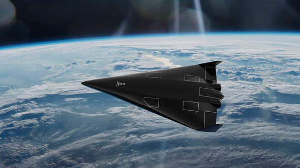 Eine Computergrafik zeigt das Aurora Raumflugzeug von Polaris während einer Mission. Die für den Hyperschallflug nötige Formgebung ist erkennbar.